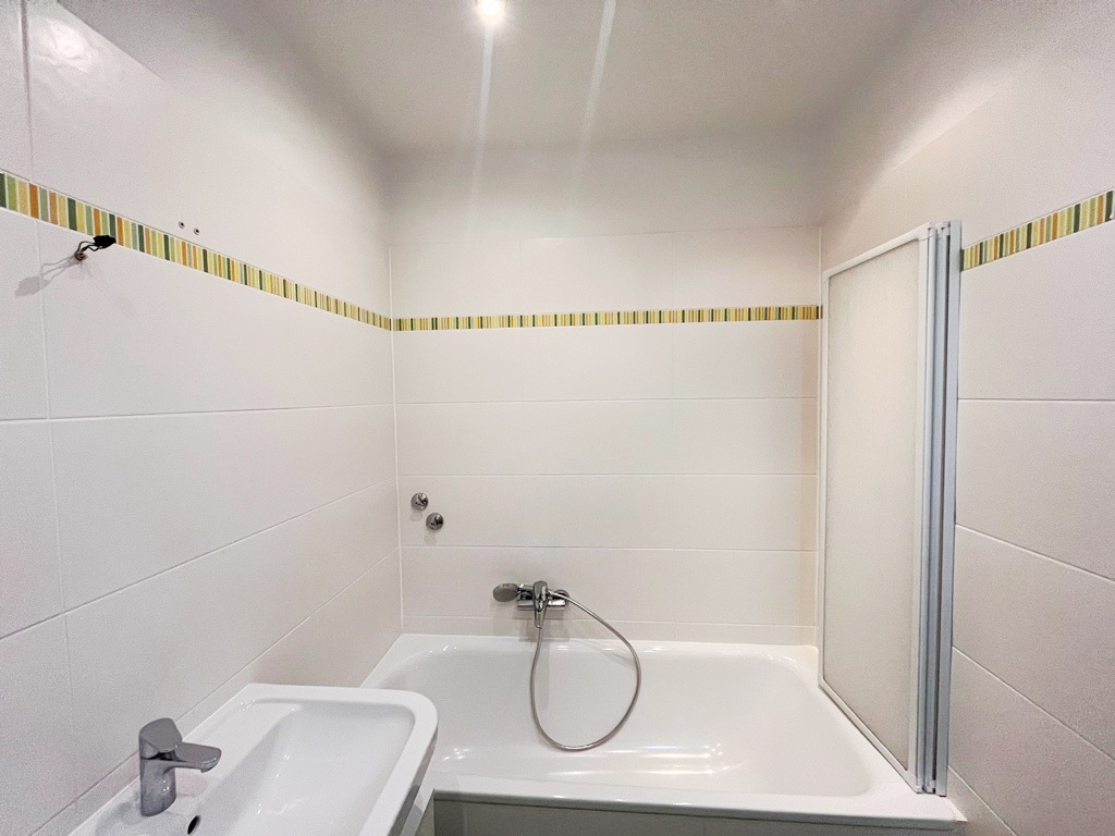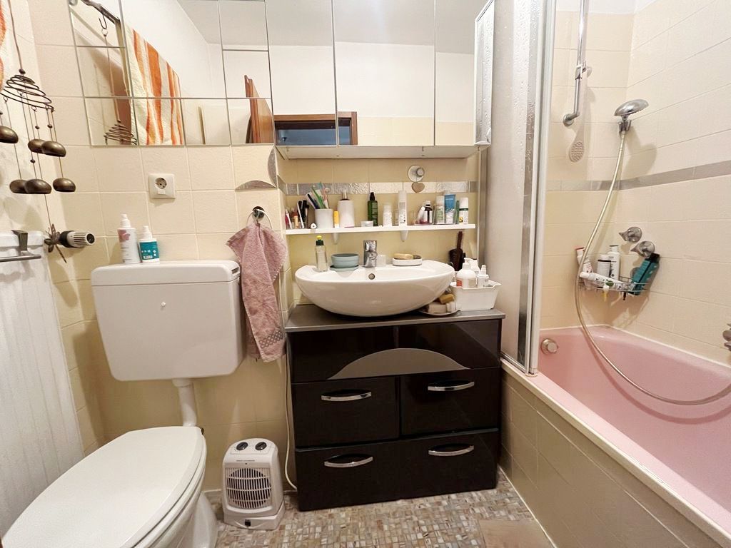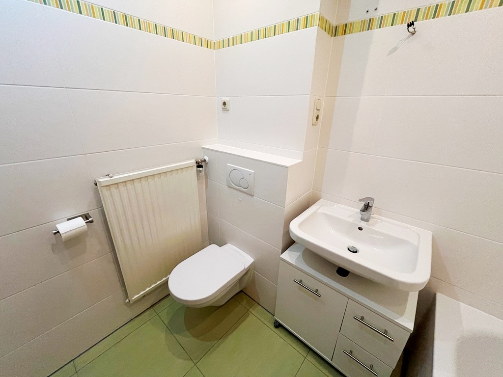 Ein innenliegendes, modernes Bad mit Badewanne, WC und Waschbecken rundet den Komfort der Wohnung ab.