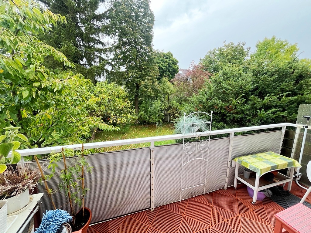 Die Wohnung im Obergeschoss ist vom Grundriss identisch zur Erdgeschosswohnung. Anstatt einer Terrasse ist hier ein ca. 5 m² großer Süd-/Ost-Balkon vorhanden. Das Badezimmer ist teilsaniert und mit einer Badewanne, WC und Waschbecken konfiguriert.