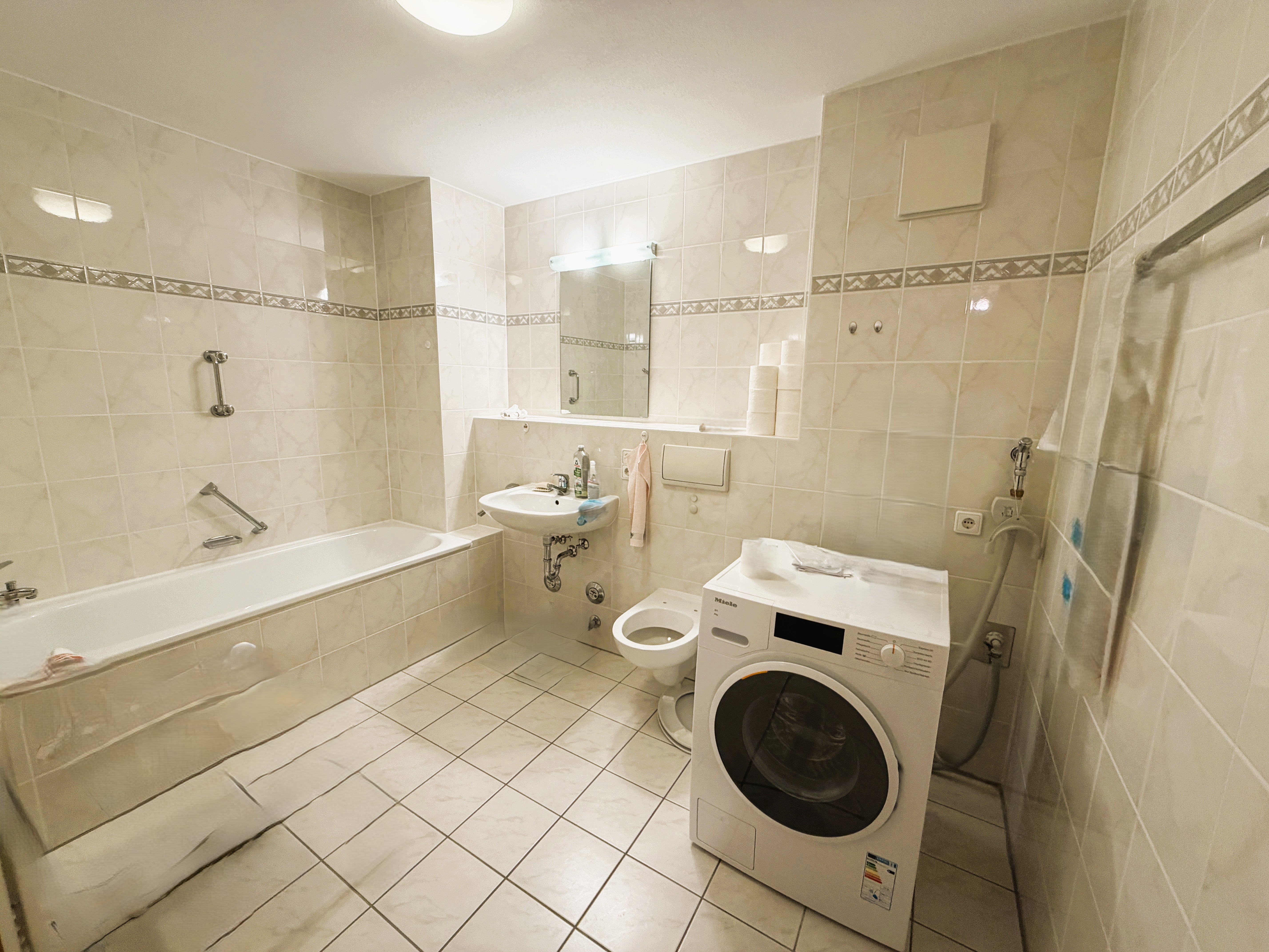 Weiter schließt sich an das Schlafzimmer das Badezimmer, mit rund 6,5 m² an. Der Sanitärraum ist hell gefliest und mit einer Badewanne, einem Waschbecken und einem WC sowie einem Heizkörper ausgestattet. Weiter befinden sich hier die Anschlüsse zum Betrieb einer Waschmaschine und eines Trockners. Selbstverständlich verfügt dieses innenliegende Badezimmer über einen Abzug zur Entlüftung.