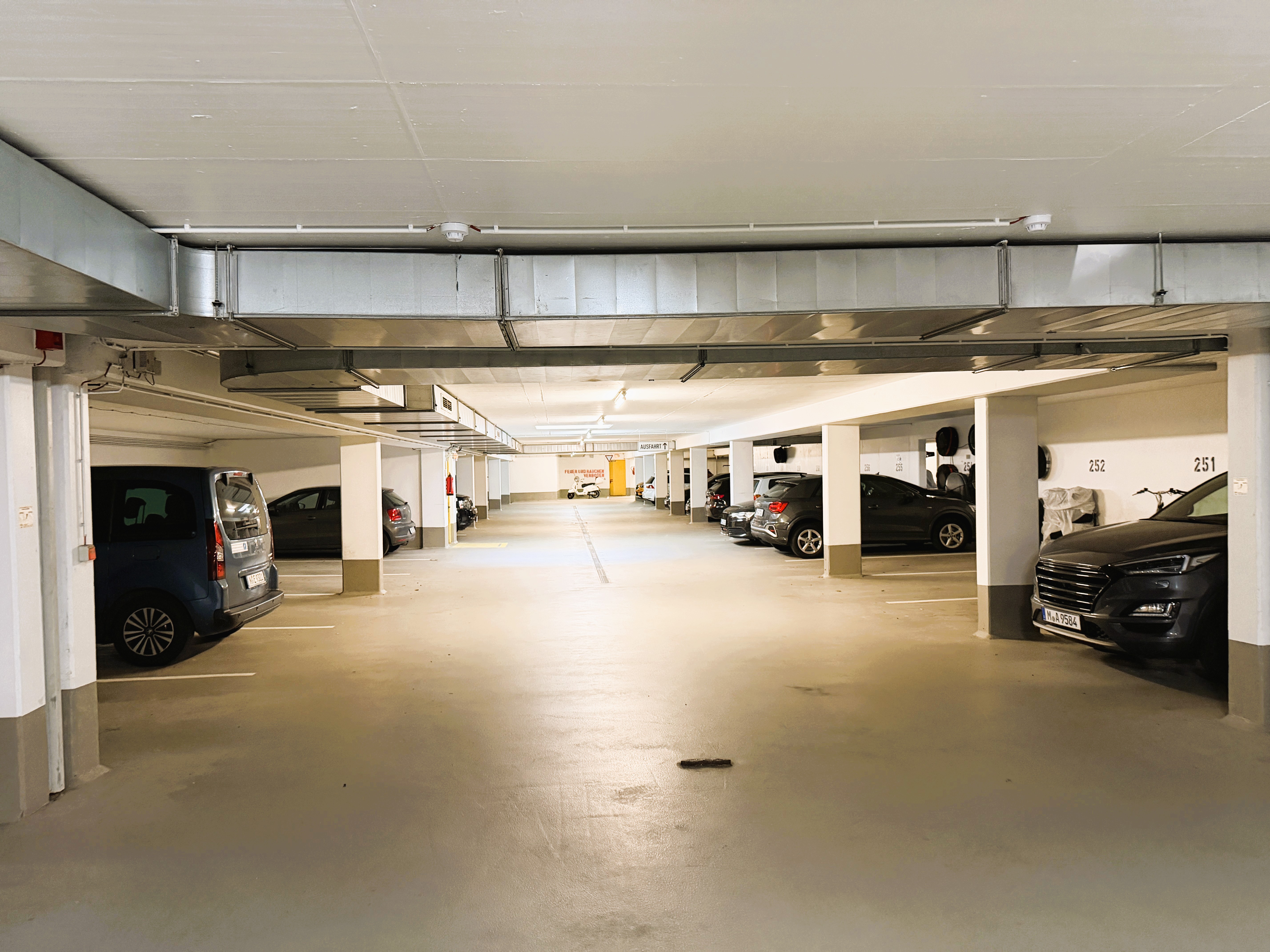 Mit der Wohnung wird ein großes und trockenes Kellerabteil miterworben. Zusätzlich wird ein ebenerdig zu befahrener Pkw-Stellplatz in der hauseigenen Tiefgarage mit verkauft.
