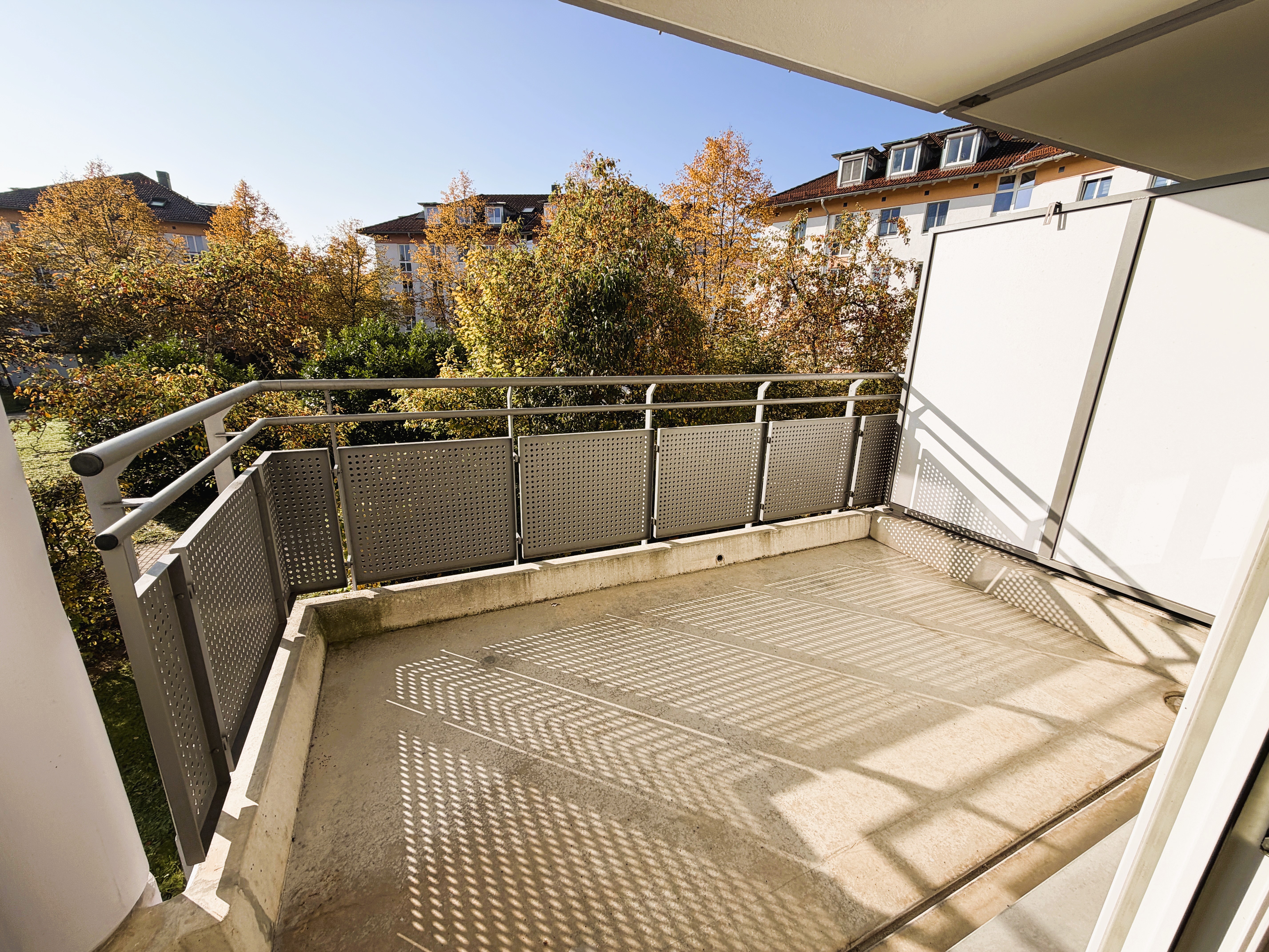 Über das Wohnzimmer haben Sie Austritt zum ca. 3,4 m² großen Süd-Balkon. Der Balkon ist komplett zum ruhigen und parkähnlichen Hofbereich ausgerichtet und ist dank seiner Überdachung auch an regnerischen Tagen nutzbar.