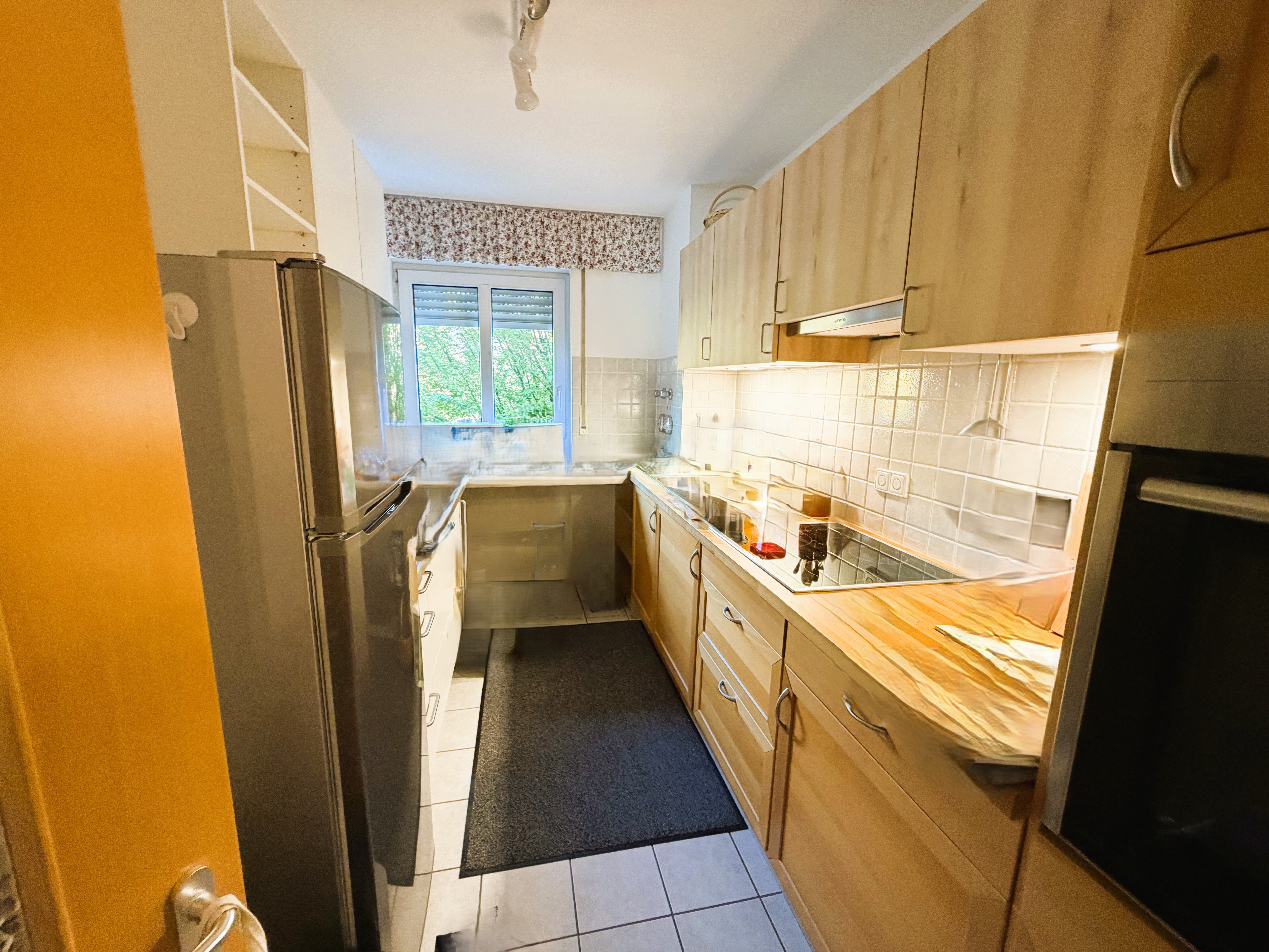 Die Küche ist etwa 7,6 m² groß und dank eines Fensters sehr hell. Im Kochbereich sind helle und pflegeleichte Bodenfliesen verlegt. Die EBK befindet sich in einem sehr guten Zustand und verfügt über ein Cerankochfeld samt Dunstabzug, einem Ofen, eine Kühl-/Gefrierkombination, ein Spülbecken, eine Geschirrspülmaschine sowie Ober- und Unterschränke. Zudem bietet die U-förmig geschnittene EBK auf den Arbeitsflächen viel Platz für Küchengeräte des täglichen Gebrauchs.
