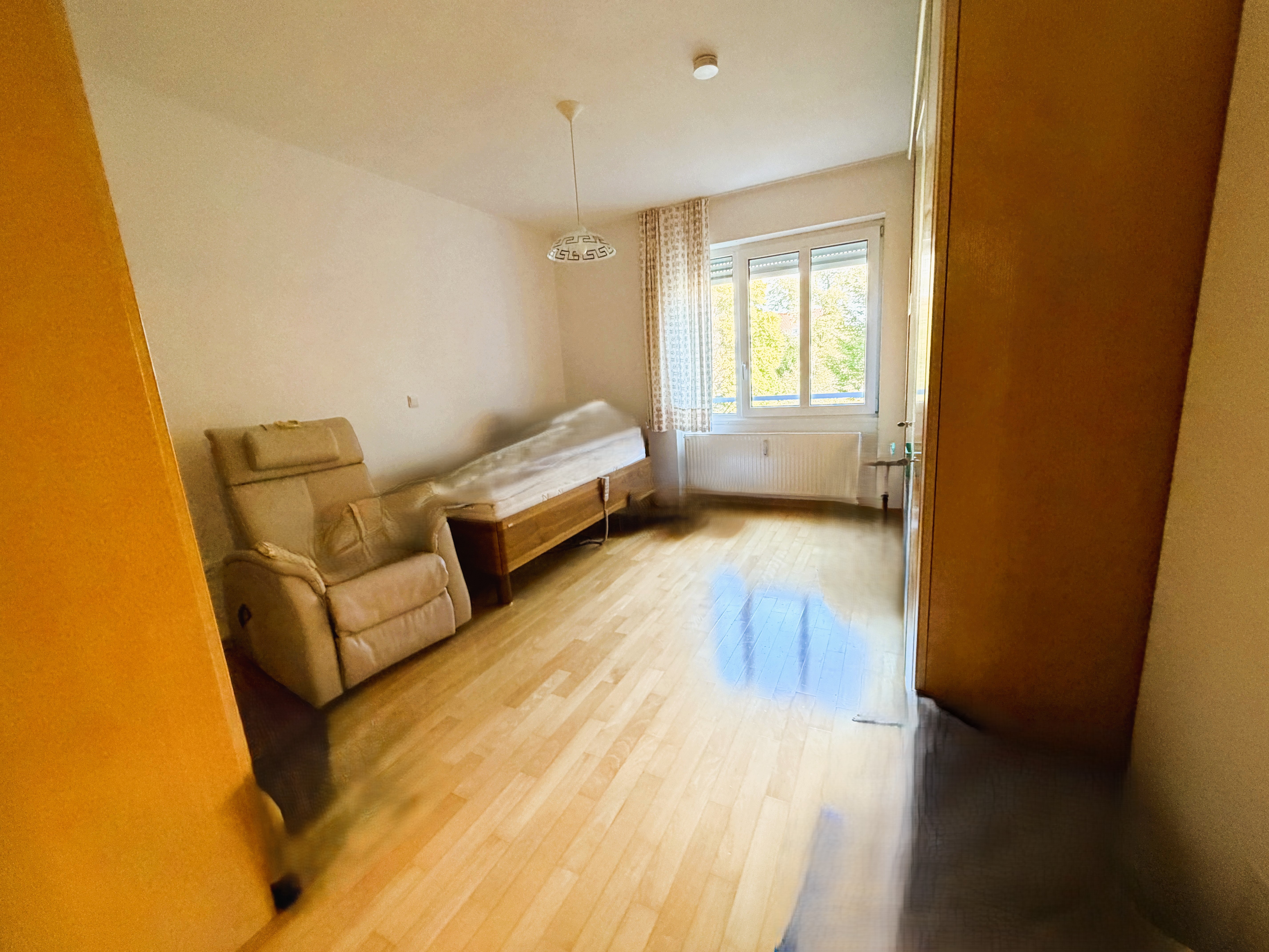 Das Wohnzimmer umfasst eine Fläche von etwa 22,7 m² und ist wie das Schlafzimmer mit gepflegten Parkettböden im Parallelverbund versehen.