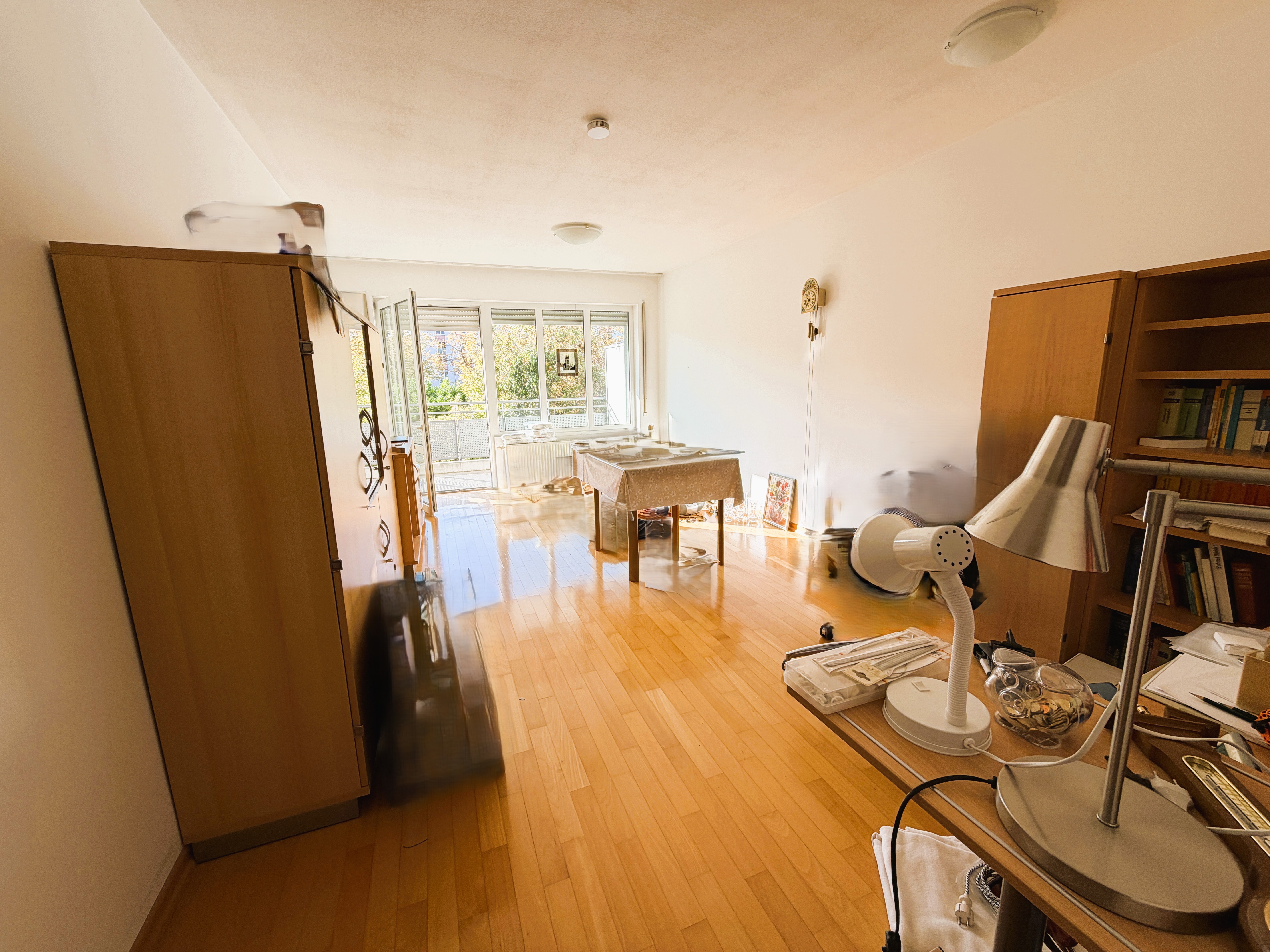 Ebenso an das Badezimmer angrenzend befindet sich das Wohnzimmer. Der großzügige und gut aufgeteilte Wohnraum ist dank seiner großen Fensterfront nach Süden sowie der bodentiefen Balkontüre und der Lage im 1. Obergeschoss sonnig und hell!