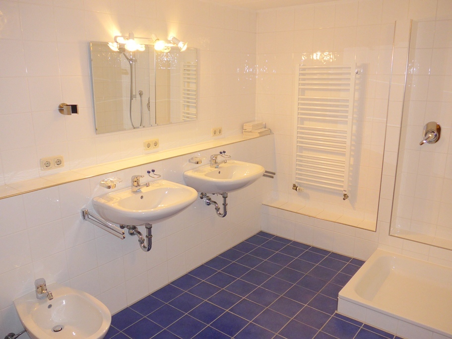 Ein modernes, hell gefliestes Badezimmer mit Badewanne und WC rundet diesen Schlafbereich ab.