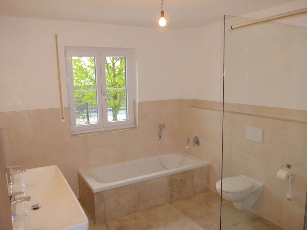Ein modernes Designerbad mit bodengleicher Dusche, separater Badewanne, Doppelwaschtisch und WC von rund 10 m² Fläche rundet das 1. OG ab.