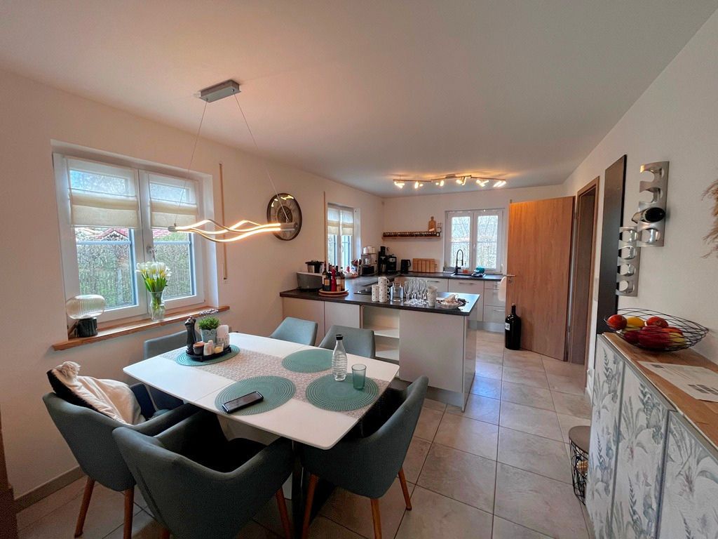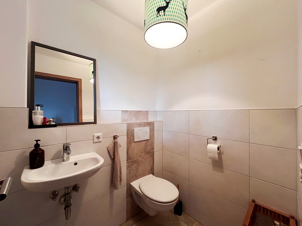Hier grenzen ein geschmackvoll gefliestes, modernes Gäste-WC mit rund 2 m² Fläche und die benachbarte Wohnküche mit ca. 20 m² an.