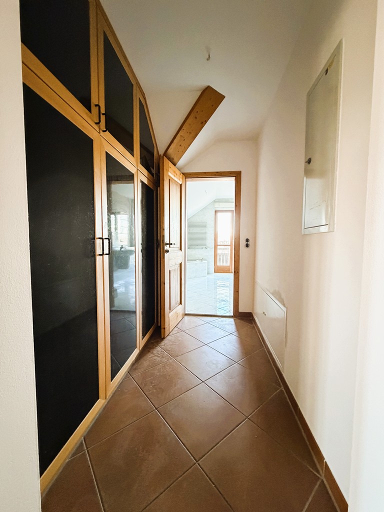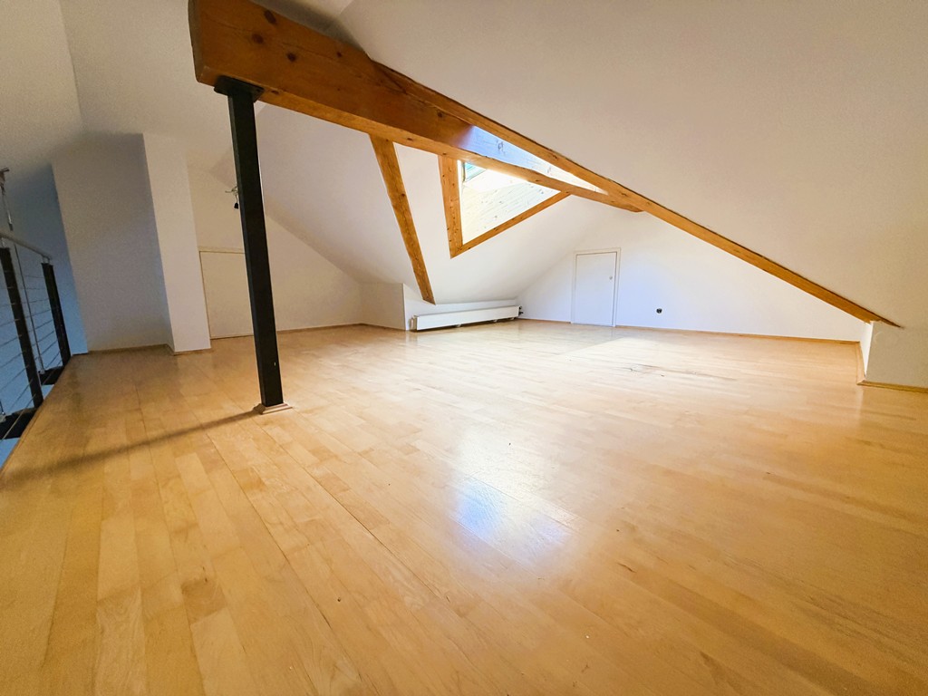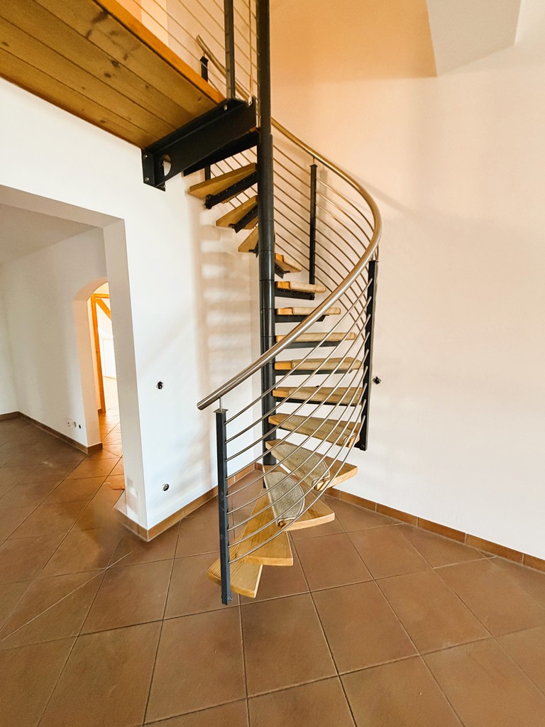 Die im Wohnzimmer vorhandene, gewendelte Stahltreppe mit Holzstufen führt zur Galerie. Dieser Bereich verfügt über eine Bodenfläche von knapp 27 m² und kann individuell genutzt werden. Die maximale Deckenhöhe beträgt hier ca. 1,80 m. Der Galeriebereich zählt nicht zur Wohnfläche.