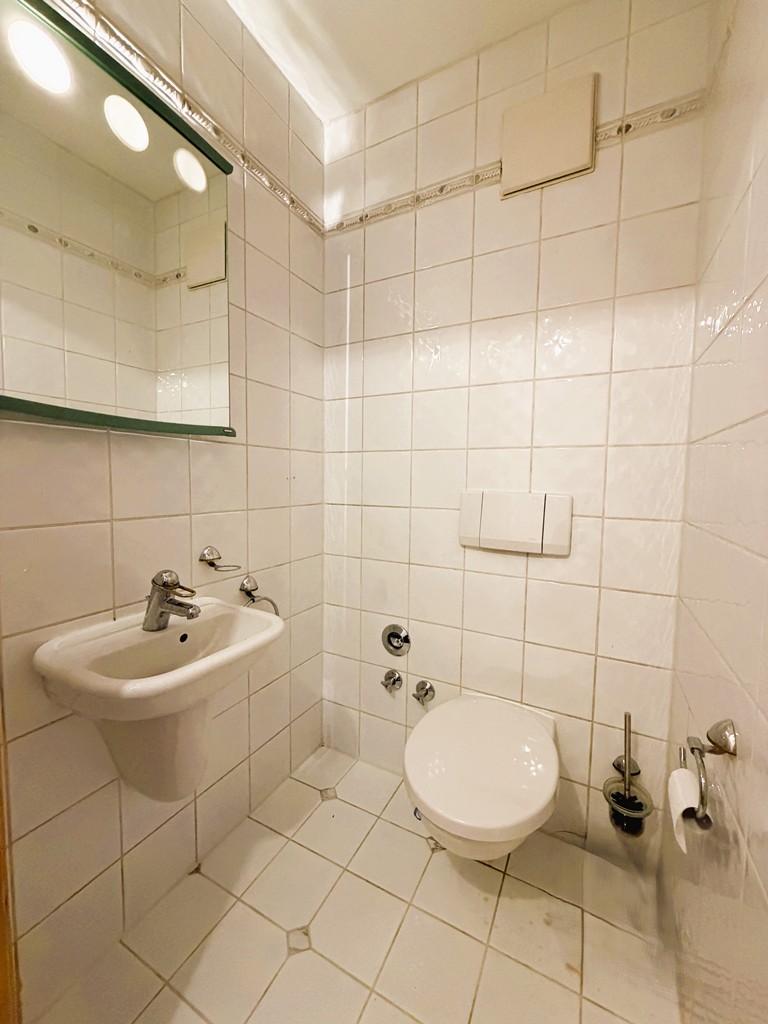 Nach Durchschreiten der Wohnungstüre befinden Sie sich in der Eingangsdiele mit Zugang zum Gäste-WC und zu einem der Wohn-/Schlafräume. Im Gäste-WC ist neben der Toilette, ein Waschbecken vorhanden.