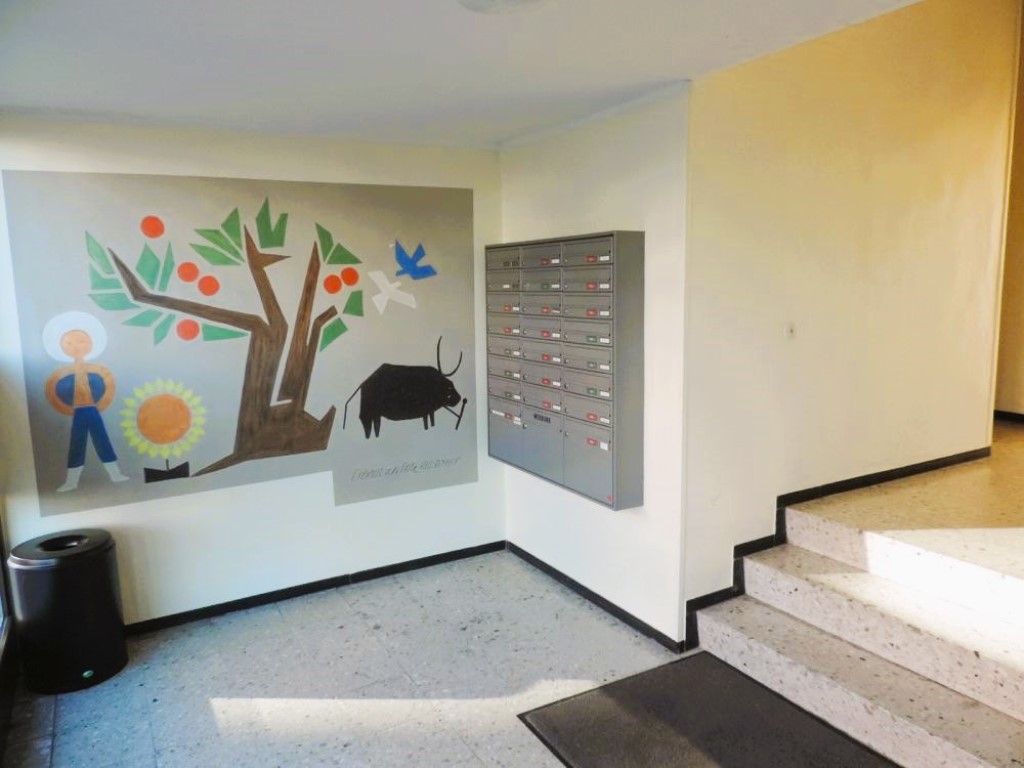 Diese rund 58 m² große Wohnung befindet sich im zweiten Obergeschoss eines Mitte der 1960er Jahre errichteten und 2008 sanierten Wohnhauses mit ca. 20 Parteien. Die Wohnung wird bequem über das helle, mit Glasbausteinen bestückte Treppenhaus oder mit einem modernen Lift erreicht.
