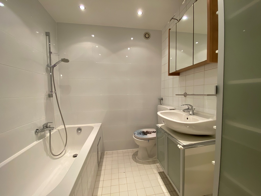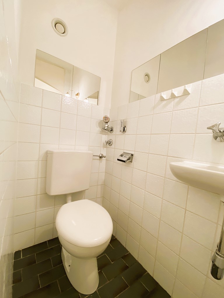 An die Schlafzimmer angrenzend befindet sich das gepflegte Badzimmer. Der Sanitärraum ist klassisch weiß gefliest und verfügt über eine Badewanne, ein Waschbecken, ein WC sowie über einen Handtuchwärmer. Zudem ist hier ein Badezimmerschrank und ein Waschbecken-Unterschrank zur Unterbringung von Kosmetika, Handtücher, etc. vorhanden.