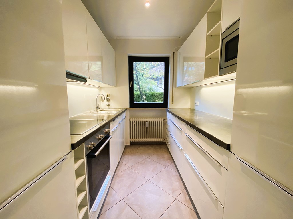 Über das Wohnzimmer haben Sie Zugang zur Küche, welche derzeit mit einer sehr gepflegten und gut ausgestatteten EBK samt E-Großgeräten versehen ist. Unter anderem befindet sich hier eine große Kühl-/Gefrierkombination, eine Geschirrspülmaschine, ein Glaskeramik-Kochfeld mit Dunstabzug so wie ein Backofen als auch Ober- und Unterschränke. Die Küche ist im Eigentum des Vermieters und verbleibt zur kostenfreien Gebrauchsüberlassung (ohne Haftung für die Küchengeräte) in der Wohnung.